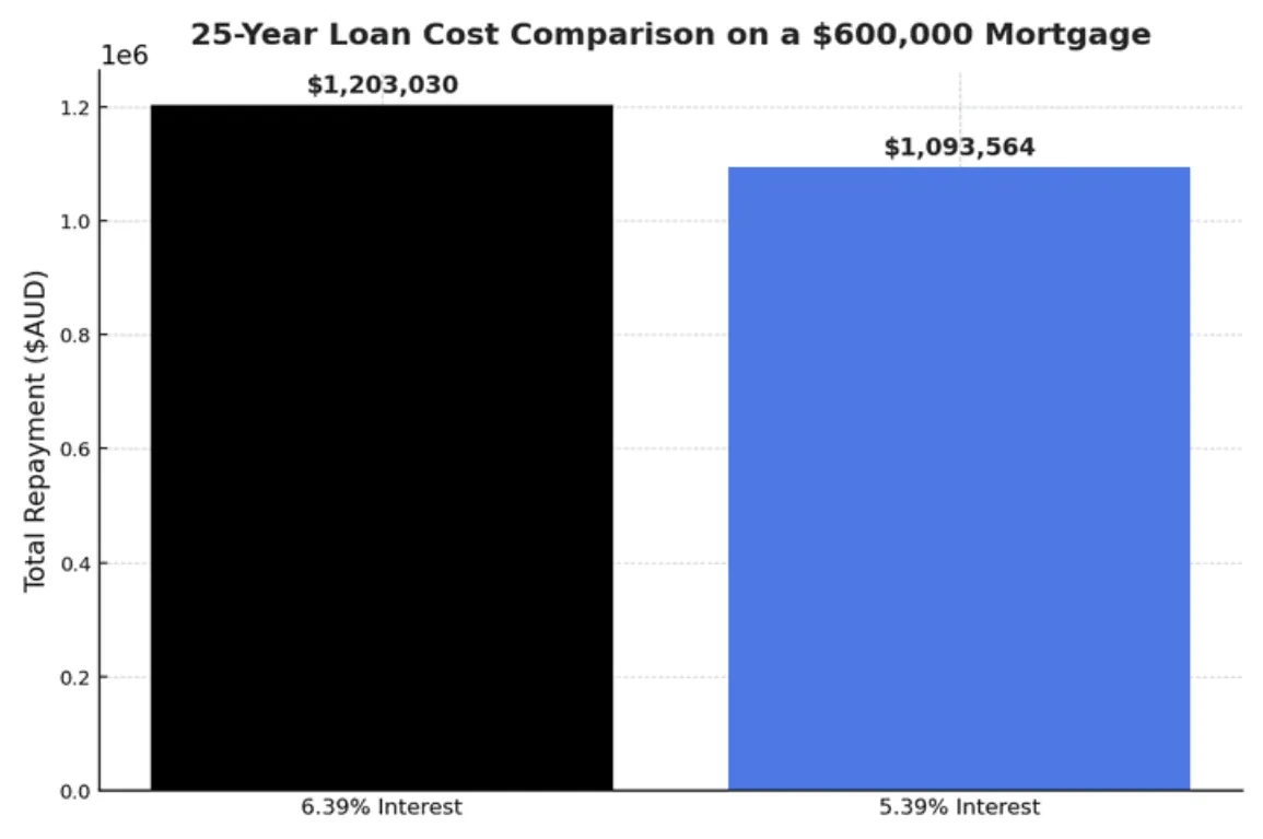 Information is general only and doesn’t consider your objectives, financial situation or needs. Your full financial situation and requirements need to be considered before any offer or acceptance of a loan product. The savings estimate is based on refinancing a $600,000 loan over 25 years, from a 6.39% comparison rate to 5.39%. Actual results will vary. This example is for general illustration purposes only and does not constitute financial advice. Eligibility criteria, rates, cashback incentives, and lender-specific offers vary and are subject to change. Offers depend on individual borrower profiles and lender terms and conditions.